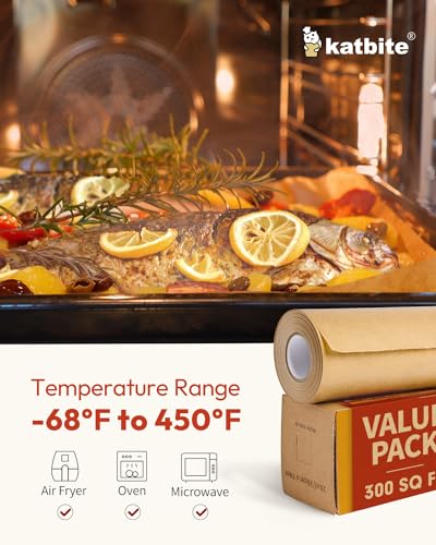 Specification: Katbite 15in x 242ft Unbleached Parchment Paper Roll, 300 Sq.Ft, Non-Keep on with Serrated Cutter for Baking, Cooking, Air Fryer