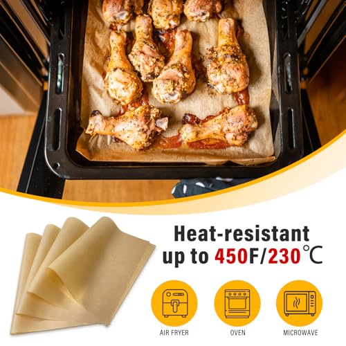 NON-STICK, WATERPROOF, HIGH TEMPERATURE RESISTANT: Baking parchment is resistant to temperatures ranging from -68°F to 450°F (not to exceed 450°F), oil-resistant, and waterproof, which means that it won’t rip, tear, or soak through. Never place parchment in the oven without food on it,food should cover at least 2/3 of the parchment.